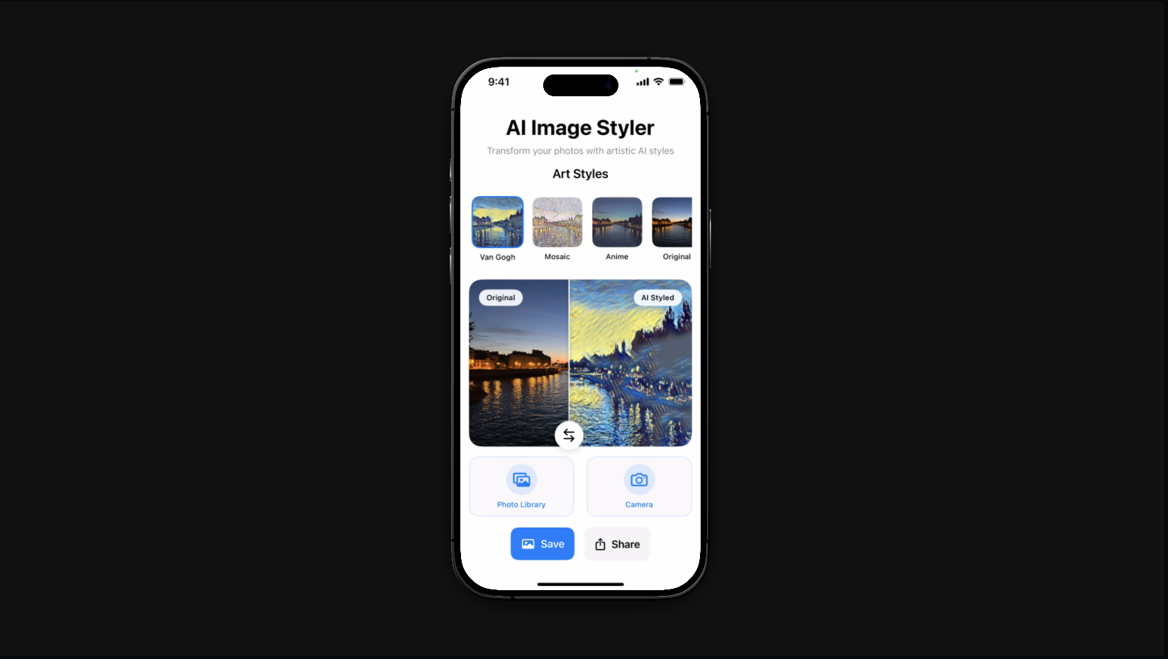 Built an AI Image Styler that transforms user photos with artistic filters powered by AI. Includes an interactive slider to instantly compare before and after results, with options to capture new photos or select from the camera roll. Users can save and share their styled images directly from the app. Designed and built in Cursor and Claude Code.