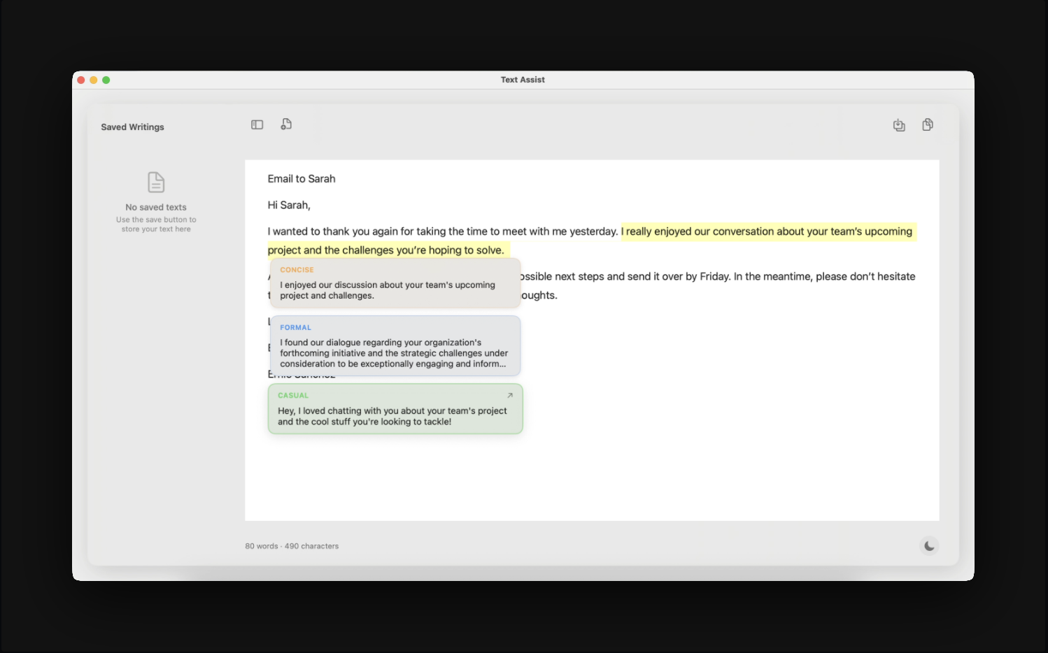 Built a smart text editor that allows users to highlight text and receive instant AI rewrite suggestions based on tone. Includes options to save drafts, copy results, and return to previous text for continued editing. Designed and built in Cursor and Claude Code.