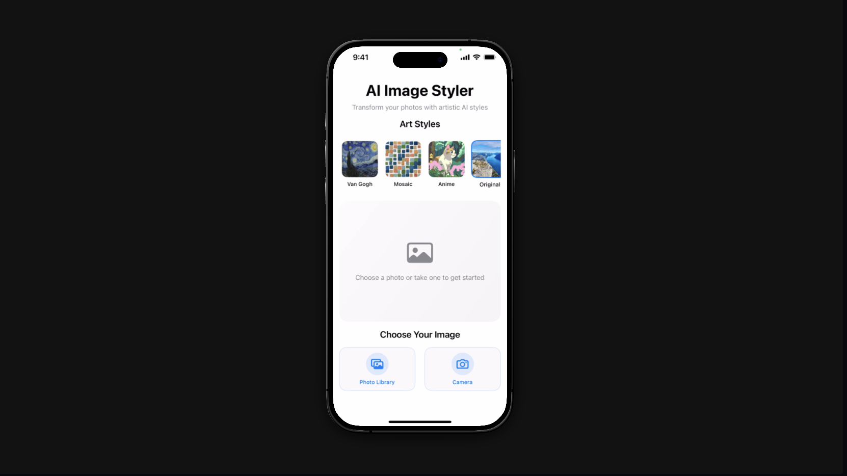 Built an AI Image Styler that transforms user photos with artistic filters powered by AI. Includes an interactive slider to instantly compare before and after results, with options to capture new photos or select from the camera roll. Users can save and share their styled images directly from the app. Designed and built in Cursor and Claude Code.